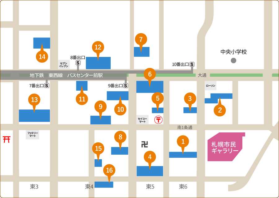 徒歩 地下鉄「大通」駅から南1条通りまたは地下道を通って東へ約15分